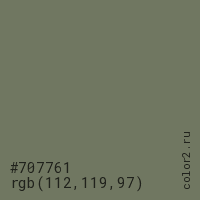 Цвет #707761 в цветовой модели RGB обозначается тремя октетами (112, 119, 97) в десятичном формате и #707761 в шестнадцатиричном (hex) формате, которые являются интенсивностью красного 112 (hex 70), интенсивность зелёного 119 (hex 77) и интенсивность синего 97 (hex 61).