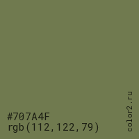 Цвет #707A4F в цветовой модели RGB обозначается тремя октетами (112, 122, 79) в десятичном формате и #707A4F в шестнадцатиричном (hex) формате, которые являются интенсивностью красного 112 (hex 70), интенсивность зелёного 122 (hex 7A) и интенсивность синего 79 (hex 4F).