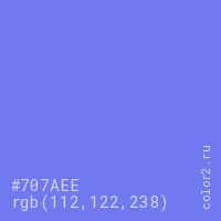 Цвет #707AEE в цветовой модели RGB обозначается тремя октетами (112, 122, 238) в десятичном формате и #707AEE в шестнадцатиричном (hex) формате, которые являются интенсивностью красного 112 (hex 70), интенсивность зелёного 122 (hex 7A) и интенсивность синего 238 (hex EE).