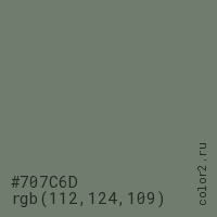 Цвет #707C6D в цветовой модели RGB обозначается тремя октетами (112, 124, 109) в десятичном формате и #707C6D в шестнадцатиричном (hex) формате, которые являются интенсивностью красного 112 (hex 70), интенсивность зелёного 124 (hex 7C) и интенсивность синего 109 (hex 6D).