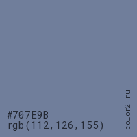 Цвет #707E9B в цветовой модели RGB обозначается тремя октетами (112, 126, 155) в десятичном формате и #707E9B в шестнадцатиричном (hex) формате, которые являются интенсивностью красного 112 (hex 70), интенсивность зелёного 126 (hex 7E) и интенсивность синего 155 (hex 9B).
