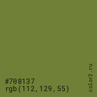 Цвет #708137 в цветовой модели RGB обозначается тремя октетами (112, 129, 55) в десятичном формате и #708137 в шестнадцатиричном (hex) формате, которые являются интенсивностью красного 112 (hex 70), интенсивность зелёного 129 (hex 81) и интенсивность синего 55 (hex 37).