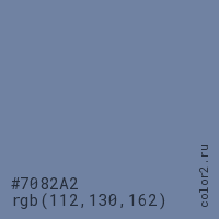 Цвет #7082A2 в цветовой модели RGB обозначается тремя октетами (112, 130, 162) в десятичном формате и #7082A2 в шестнадцатиричном (hex) формате, которые являются интенсивностью красного 112 (hex 70), интенсивность зелёного 130 (hex 82) и интенсивность синего 162 (hex A2).