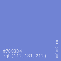 Цвет #7083D4 в цветовой модели RGB обозначается тремя октетами (112, 131, 212) в десятичном формате и #7083D4 в шестнадцатиричном (hex) формате, которые являются интенсивностью красного 112 (hex 70), интенсивность зелёного 131 (hex 83) и интенсивность синего 212 (hex D4).