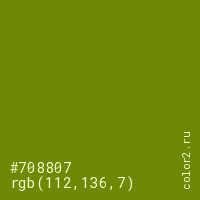 Цвет #708807 в цветовой модели RGB обозначается тремя октетами (112, 136, 7) в десятичном формате и #708807 в шестнадцатиричном (hex) формате, которые являются интенсивностью красного 112 (hex 70), интенсивность зелёного 136 (hex 88) и интенсивность синего 7 (hex 07).