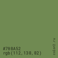 Цвет #708A52 в цветовой модели RGB обозначается тремя октетами (112, 138, 82) в десятичном формате и #708A52 в шестнадцатиричном (hex) формате, которые являются интенсивностью красного 112 (hex 70), интенсивность зелёного 138 (hex 8A) и интенсивность синего 82 (hex 52).