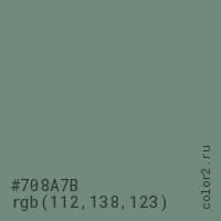 Цвет #708A7B в цветовой модели RGB обозначается тремя октетами (112, 138, 123) в десятичном формате и #708A7B в шестнадцатиричном (hex) формате, которые являются интенсивностью красного 112 (hex 70), интенсивность зелёного 138 (hex 8A) и интенсивность синего 123 (hex 7B).