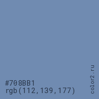 Цвет #708BB1 в цветовой модели RGB обозначается тремя октетами (112, 139, 177) в десятичном формате и #708BB1 в шестнадцатиричном (hex) формате, которые являются интенсивностью красного 112 (hex 70), интенсивность зелёного 139 (hex 8B) и интенсивность синего 177 (hex B1).
