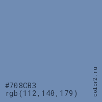 Цвет #708CB3 в цветовой модели RGB обозначается тремя октетами (112, 140, 179) в десятичном формате и #708CB3 в шестнадцатиричном (hex) формате, которые являются интенсивностью красного 112 (hex 70), интенсивность зелёного 140 (hex 8C) и интенсивность синего 179 (hex B3).