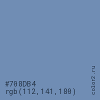 Цвет #708DB4 в цветовой модели RGB обозначается тремя октетами (112, 141, 180) в десятичном формате и #708DB4 в шестнадцатиричном (hex) формате, которые являются интенсивностью красного 112 (hex 70), интенсивность зелёного 141 (hex 8D) и интенсивность синего 180 (hex B4).