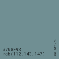 Цвет #708F93 в цветовой модели RGB обозначается тремя октетами (112, 143, 147) в десятичном формате и #708F93 в шестнадцатиричном (hex) формате, которые являются интенсивностью красного 112 (hex 70), интенсивность зелёного 143 (hex 8F) и интенсивность синего 147 (hex 93).