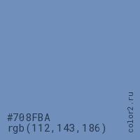 Цвет #708FBA в цветовой модели RGB обозначается тремя октетами (112, 143, 186) в десятичном формате и #708FBA в шестнадцатиричном (hex) формате, которые являются интенсивностью красного 112 (hex 70), интенсивность зелёного 143 (hex 8F) и интенсивность синего 186 (hex BA).