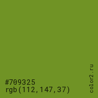Цвет #709325 в цветовой модели RGB обозначается тремя октетами (112, 147, 37) в десятичном формате и #709325 в шестнадцатиричном (hex) формате, которые являются интенсивностью красного 112 (hex 70), интенсивность зелёного 147 (hex 93) и интенсивность синего 37 (hex 25).