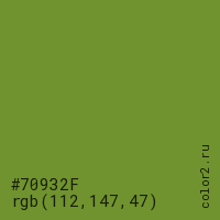 Цвет #70932F в цветовой модели RGB обозначается тремя октетами (112, 147, 47) в десятичном формате и #70932F в шестнадцатиричном (hex) формате, которые являются интенсивностью красного 112 (hex 70), интенсивность зелёного 147 (hex 93) и интенсивность синего 47 (hex 2F).