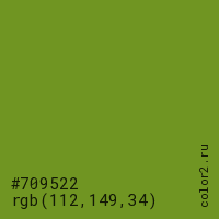 Цвет #709522 в цветовой модели RGB обозначается тремя октетами (112, 149, 34) в десятичном формате и #709522 в шестнадцатиричном (hex) формате, которые являются интенсивностью красного 112 (hex 70), интенсивность зелёного 149 (hex 95) и интенсивность синего 34 (hex 22).