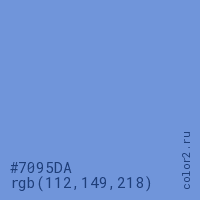 Цвет #7095DA в цветовой модели RGB обозначается тремя октетами (112, 149, 218) в десятичном формате и #7095DA в шестнадцатиричном (hex) формате, которые являются интенсивностью красного 112 (hex 70), интенсивность зелёного 149 (hex 95) и интенсивность синего 218 (hex DA).
