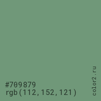 Цвет #709879 в цветовой модели RGB обозначается тремя октетами (112, 152, 121) в десятичном формате и #709879 в шестнадцатиричном (hex) формате, которые являются интенсивностью красного 112 (hex 70), интенсивность зелёного 152 (hex 98) и интенсивность синего 121 (hex 79).