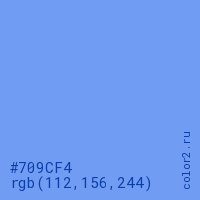 Цвет #709CF4 в цветовой модели RGB обозначается тремя октетами (112, 156, 244) в десятичном формате и #709CF4 в шестнадцатиричном (hex) формате, которые являются интенсивностью красного 112 (hex 70), интенсивность зелёного 156 (hex 9C) и интенсивность синего 244 (hex F4).