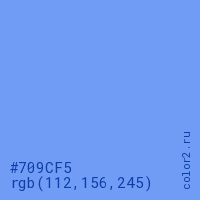 Цвет #709CF5 в цветовой модели RGB обозначается тремя октетами (112, 156, 245) в десятичном формате и #709CF5 в шестнадцатиричном (hex) формате, которые являются интенсивностью красного 112 (hex 70), интенсивность зелёного 156 (hex 9C) и интенсивность синего 245 (hex F5).