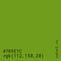 Цвет #709E1C в цветовой модели RGB обозначается тремя октетами (112, 158, 28) в десятичном формате и #709E1C в шестнадцатиричном (hex) формате, которые являются интенсивностью красного 112 (hex 70), интенсивность зелёного 158 (hex 9E) и интенсивность синего 28 (hex 1C).