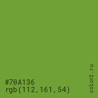 Цвет #70A136 в цветовой модели RGB обозначается тремя октетами (112, 161, 54) в десятичном формате и #70A136 в шестнадцатиричном (hex) формате, которые являются интенсивностью красного 112 (hex 70), интенсивность зелёного 161 (hex A1) и интенсивность синего 54 (hex 36).