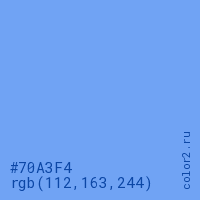 Цвет #70A3F4 в цветовой модели RGB обозначается тремя октетами (112, 163, 244) в десятичном формате и #70A3F4 в шестнадцатиричном (hex) формате, которые являются интенсивностью красного 112 (hex 70), интенсивность зелёного 163 (hex A3) и интенсивность синего 244 (hex F4).