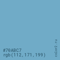 Цвет #70ABC7 в цветовой модели RGB обозначается тремя октетами (112, 171, 199) в десятичном формате и #70ABC7 в шестнадцатиричном (hex) формате, которые являются интенсивностью красного 112 (hex 70), интенсивность зелёного 171 (hex AB) и интенсивность синего 199 (hex C7).