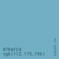 Цвет #70AFC4 в цветовой модели RGB обозначается тремя октетами (112, 175, 196) в десятичном формате и #70AFC4 в шестнадцатиричном (hex) формате, которые являются интенсивностью красного 112 (hex 70), интенсивность зелёного 175 (hex AF) и интенсивность синего 196 (hex C4).