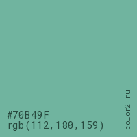Цвет #70B49F в цветовой модели RGB обозначается тремя октетами (112, 180, 159) в десятичном формате и #70B49F в шестнадцатиричном (hex) формате, которые являются интенсивностью красного 112 (hex 70), интенсивность зелёного 180 (hex B4) и интенсивность синего 159 (hex 9F).