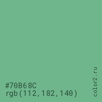 Цвет #70B68C в цветовой модели RGB обозначается тремя октетами (112, 182, 140) в десятичном формате и #70B68C в шестнадцатиричном (hex) формате, которые являются интенсивностью красного 112 (hex 70), интенсивность зелёного 182 (hex B6) и интенсивность синего 140 (hex 8C).