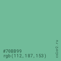 Цвет #70BB99 в цветовой модели RGB обозначается тремя октетами (112, 187, 153) в десятичном формате и #70BB99 в шестнадцатиричном (hex) формате, которые являются интенсивностью красного 112 (hex 70), интенсивность зелёного 187 (hex BB) и интенсивность синего 153 (hex 99).