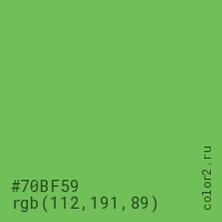 Цвет #70BF59 в цветовой модели RGB обозначается тремя октетами (112, 191, 89) в десятичном формате и #70BF59 в шестнадцатиричном (hex) формате, которые являются интенсивностью красного 112 (hex 70), интенсивность зелёного 191 (hex BF) и интенсивность синего 89 (hex 59).