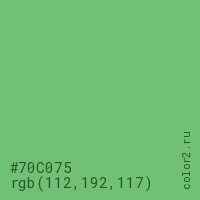 Цвет #70C075 в цветовой модели RGB обозначается тремя октетами (112, 192, 117) в десятичном формате и #70C075 в шестнадцатиричном (hex) формате, которые являются интенсивностью красного 112 (hex 70), интенсивность зелёного 192 (hex C0) и интенсивность синего 117 (hex 75).