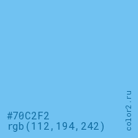 Цвет #70C2F2 в цветовой модели RGB обозначается тремя октетами (112, 194, 242) в десятичном формате и #70C2F2 в шестнадцатиричном (hex) формате, которые являются интенсивностью красного 112 (hex 70), интенсивность зелёного 194 (hex C2) и интенсивность синего 242 (hex F2).