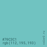 Цвет #70C3C1 в цветовой модели RGB обозначается тремя октетами (112, 195, 193) в десятичном формате и #70C3C1 в шестнадцатиричном (hex) формате, которые являются интенсивностью красного 112 (hex 70), интенсивность зелёного 195 (hex C3) и интенсивность синего 193 (hex C1).