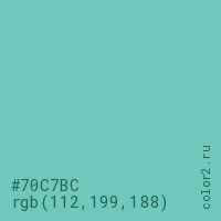 Цвет #70C7BC в цветовой модели RGB обозначается тремя октетами (112, 199, 188) в десятичном формате и #70C7BC в шестнадцатиричном (hex) формате, которые являются интенсивностью красного 112 (hex 70), интенсивность зелёного 199 (hex C7) и интенсивность синего 188 (hex BC).