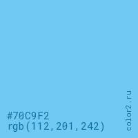 Цвет #70C9F2 в цветовой модели RGB обозначается тремя октетами (112, 201, 242) в десятичном формате и #70C9F2 в шестнадцатиричном (hex) формате, которые являются интенсивностью красного 112 (hex 70), интенсивность зелёного 201 (hex C9) и интенсивность синего 242 (hex F2).