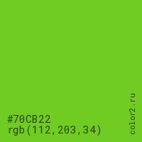 Цвет #70CB22 в цветовой модели RGB обозначается тремя октетами (112, 203, 34) в десятичном формате и #70CB22 в шестнадцатиричном (hex) формате, которые являются интенсивностью красного 112 (hex 70), интенсивность зелёного 203 (hex CB) и интенсивность синего 34 (hex 22).