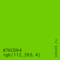 Цвет #70CD04 в цветовой модели RGB обозначается тремя октетами (112, 205, 4) в десятичном формате и #70CD04 в шестнадцатиричном (hex) формате, которые являются интенсивностью красного 112 (hex 70), интенсивность зелёного 205 (hex CD) и интенсивность синего 4 (hex 04).