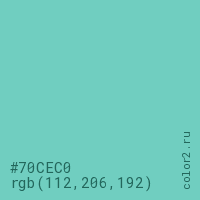 Цвет #70CEC0 в цветовой модели RGB обозначается тремя октетами (112, 206, 192) в десятичном формате и #70CEC0 в шестнадцатиричном (hex) формате, которые являются интенсивностью красного 112 (hex 70), интенсивность зелёного 206 (hex CE) и интенсивность синего 192 (hex C0).