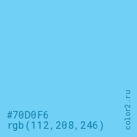 Цвет #70D0F6 в цветовой модели RGB обозначается тремя октетами (112, 208, 246) в десятичном формате и #70D0F6 в шестнадцатиричном (hex) формате, которые являются интенсивностью красного 112 (hex 70), интенсивность зелёного 208 (hex D0) и интенсивность синего 246 (hex F6).