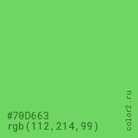 Цвет #70D663 в цветовой модели RGB обозначается тремя октетами (112, 214, 99) в десятичном формате и #70D663 в шестнадцатиричном (hex) формате, которые являются интенсивностью красного 112 (hex 70), интенсивность зелёного 214 (hex D6) и интенсивность синего 99 (hex 63).
