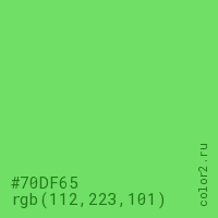Цвет #70DF65 в цветовой модели RGB обозначается тремя октетами (112, 223, 101) в десятичном формате и #70DF65 в шестнадцатиричном (hex) формате, которые являются интенсивностью красного 112 (hex 70), интенсивность зелёного 223 (hex DF) и интенсивность синего 101 (hex 65).