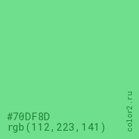 Цвет #70DF8D в цветовой модели RGB обозначается тремя октетами (112, 223, 141) в десятичном формате и #70DF8D в шестнадцатиричном (hex) формате, которые являются интенсивностью красного 112 (hex 70), интенсивность зелёного 223 (hex DF) и интенсивность синего 141 (hex 8D).