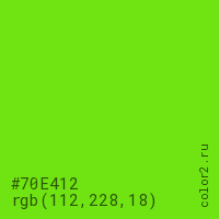 Цвет #70E412 в цветовой модели RGB обозначается тремя октетами (112, 228, 18) в десятичном формате и #70E412 в шестнадцатиричном (hex) формате, которые являются интенсивностью красного 112 (hex 70), интенсивность зелёного 228 (hex E4) и интенсивность синего 18 (hex 12).