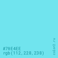 Цвет #70E4EE в цветовой модели RGB обозначается тремя октетами (112, 228, 238) в десятичном формате и #70E4EE в шестнадцатиричном (hex) формате, которые являются интенсивностью красного 112 (hex 70), интенсивность зелёного 228 (hex E4) и интенсивность синего 238 (hex EE).