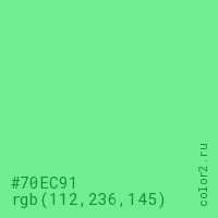 Цвет #70EC91 в цветовой модели RGB обозначается тремя октетами (112, 236, 145) в десятичном формате и #70EC91 в шестнадцатиричном (hex) формате, которые являются интенсивностью красного 112 (hex 70), интенсивность зелёного 236 (hex EC) и интенсивность синего 145 (hex 91).