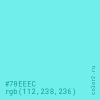 Цвет #70EEEC в цветовой модели RGB обозначается тремя октетами (112, 238, 236) в десятичном формате и #70EEEC в шестнадцатиричном (hex) формате, которые являются интенсивностью красного 112 (hex 70), интенсивность зелёного 238 (hex EE) и интенсивность синего 236 (hex EC).
