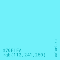 Цвет #70F1FA в цветовой модели RGB обозначается тремя октетами (112, 241, 250) в десятичном формате и #70F1FA в шестнадцатиричном (hex) формате, которые являются интенсивностью красного 112 (hex 70), интенсивность зелёного 241 (hex F1) и интенсивность синего 250 (hex FA).
