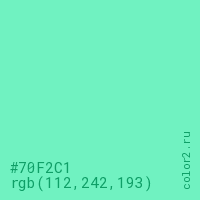 Цвет #70F2C1 в цветовой модели RGB обозначается тремя октетами (112, 242, 193) в десятичном формате и #70F2C1 в шестнадцатиричном (hex) формате, которые являются интенсивностью красного 112 (hex 70), интенсивность зелёного 242 (hex F2) и интенсивность синего 193 (hex C1).